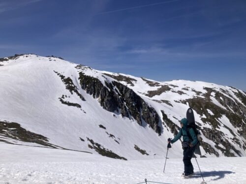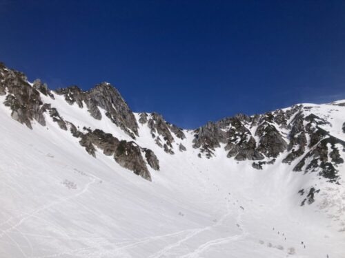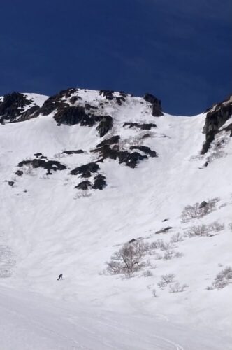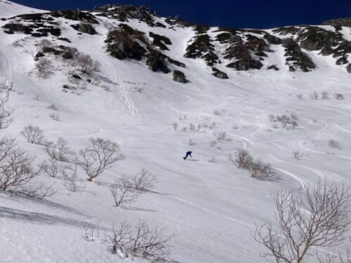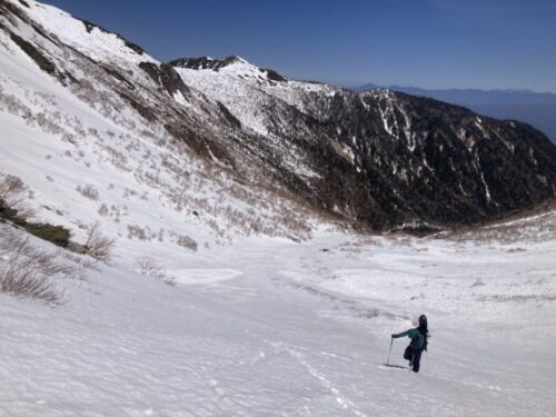 山頂から登山者の視線を浴びながら黒川源頭部へ。
