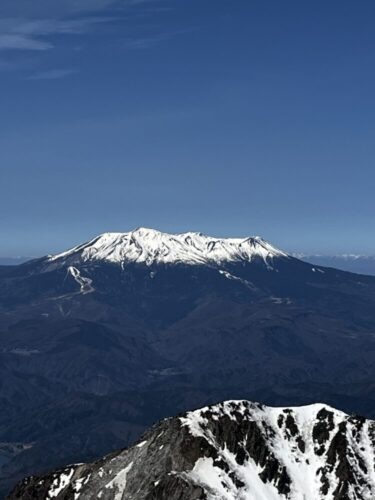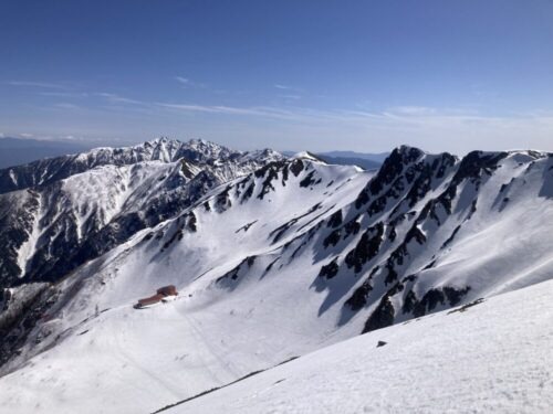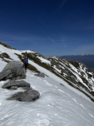 真ん中に見える岩とハイマツの尾根をアルパインクライミングしているパーティーが居ました。